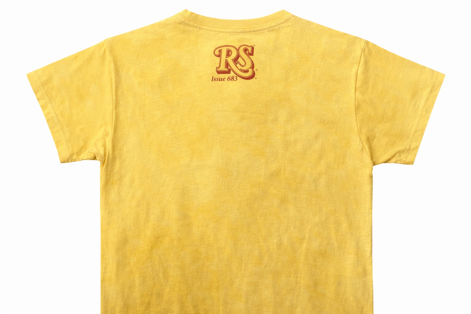 ボディはイエローカラーにウォッシュ加工が施され、 新品ながらヴィンテージTシャツのようなフェード感・風合いが魅力。 バックネックには RS Issue 683 のロゴ入りで、Rolling Stone Collectionらしいディテールもポイントです。